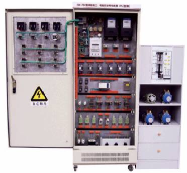 該裝置按標準電氣控制柜設(shè)計制造規(guī)格,充分利用雙面位置,柜內(nèi)裝有完成各種照明電路所需的單相電度表、日光燈、單聯(lián)開關(guān)、插座、感應(yīng)開關(guān)、漏電開關(guān)等,以及電氣控制所需要的多種低壓電器,如漏電斷路器、熔斷器、電流互感器、交流接觸器、時間繼電器、熱繼電器、中間繼電器、行程開關(guān)、按鈕、信號燈、轉(zhuǎn)換開關(guān)、電壓表、電流表、功率表及電度表等,為了延長電器使用壽命,各電器的接點都與接線端子相連,再由接線端子與被控制電氣連接。