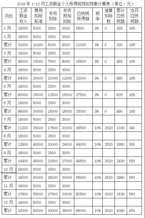 1月累計預(yù)扣預(yù)繳應(yīng)納稅所得額=累計收入-累計免稅收入-累計減除費用-累計專項扣除-累計專項附加扣除-累計依法確定的其他扣除=16000-5000-2500-3000=5500,對應(yīng)稅率為3%。