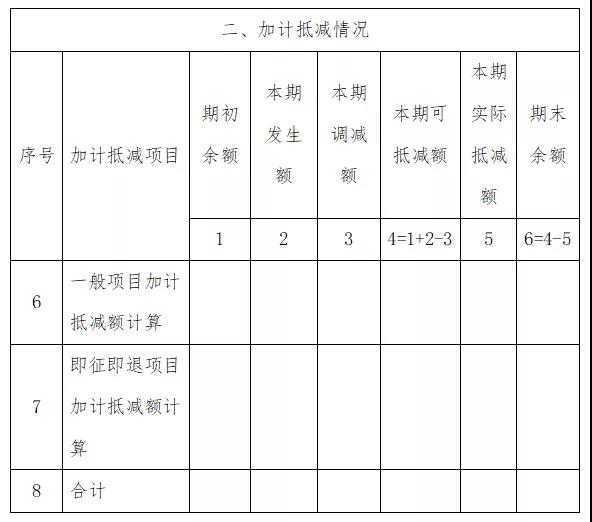 《附列資料(四)》第6至8行僅限適用加計抵減政策的納稅人填寫,反映其加計抵減情況。其他納稅人不需填寫。第8行“合計”等于第6行、第7行之和。各列說明如下: